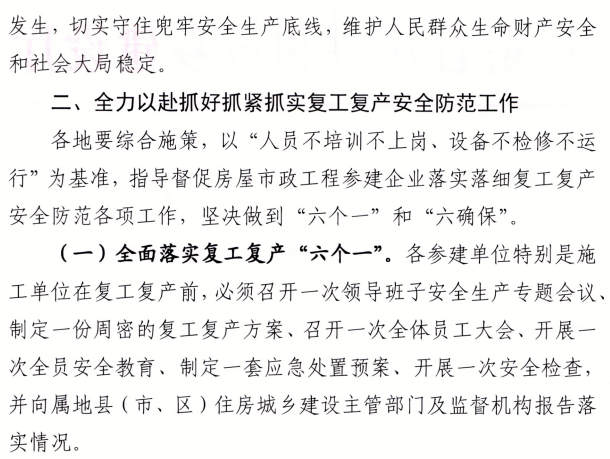建設單位項目負責人,施工單位項目負責人、技術負責人及現場專職安全管理人員,監理單位項目總監、專業監理工程師等關鍵崗位人員必須到位履職,制定復工復產計劃,落實安全防范各項措施。