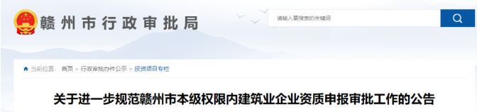 12月1日,贛州市行政審批局發布《關于進一步規范贛州市本級權限內建筑業企業資質申報審批工作的公告》,提出: